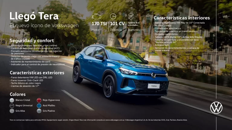 Dale tu propio estilo a tu Volkswagen Tera. Elegí entre seis colores que lo hacen único: los clásicos Blanco Cristal, Negro Universal y Gris Platino, o atrevete a destacar con los nuevos Azul Malibu, Gris Alba y Rojo Hypernova.